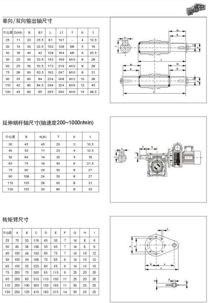 單向/雙向輸出軸尺寸延伸蝸輪軸尺寸(軸速度200-100r/min)轉矩臂尺寸